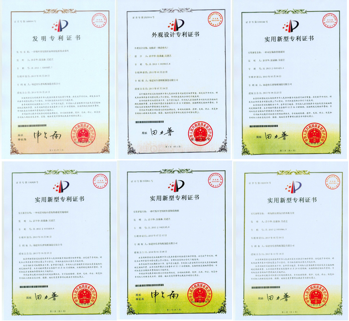 近日,公司傳來喜訊,公司申請的恒溫陶瓷地板集成系統(tǒng)等共計(jì)12項(xiàng)實(shí)用新型專利已獲得授權(quán),今已領(lǐng)取國家頒發(fā)的專利證書。